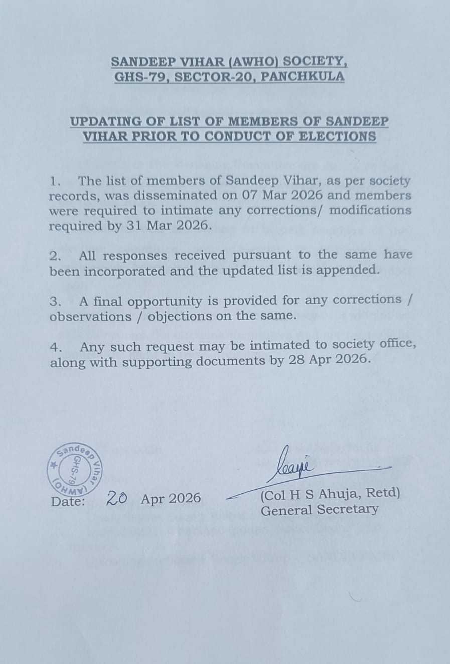 1. List of members of Sandeep Vihar on date, as per society records, is appended. Any corrections / modifications required may be intimated to the society office, along with supporting documents by 31 March 2026.